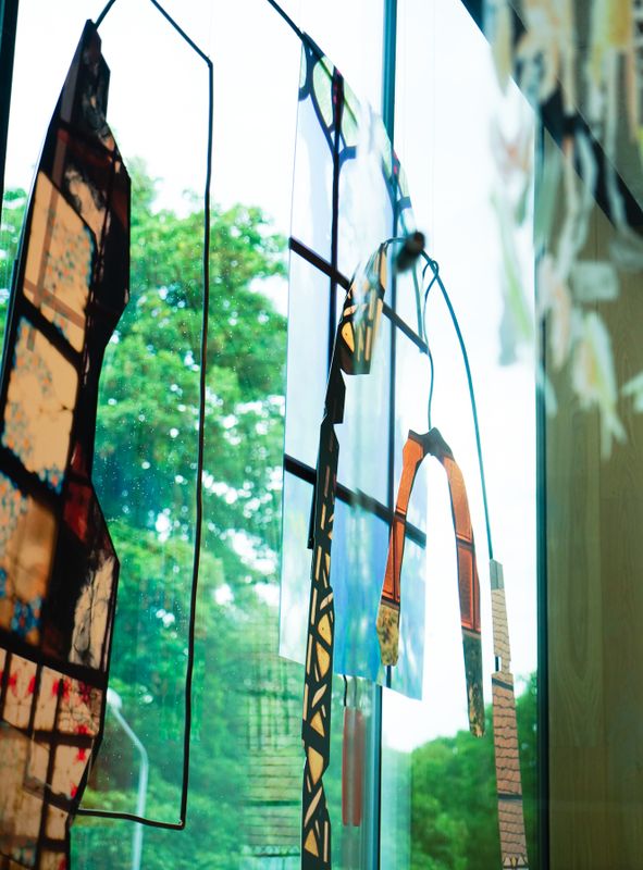 “In de ontmoeting met oud glas in de villa van Singer Laren vond ik schilderkunst,” vertelt ze. “Het gefragmenteerd beeld nodigt uit tot een bepaalde schildertoets – het schakeren van licht en kleur vertaalt zich naar penseelstreken.”