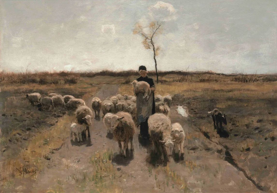 In zijn laatste levensjaren in Laren schildert Mauve voornamelijk heidelandschappen met schapen, zo ook dit tafereel op de hei met door de zon oplichtende schapen. Het voor Mauve kenmerkende fijn geschilderde sprietige berkenboompje in de achtergrond staat op het punt om uit te botten. Het pasgeboren lam, het boompje en het zonlicht symboliseren het begin van nieuw leven in het voorjaar.