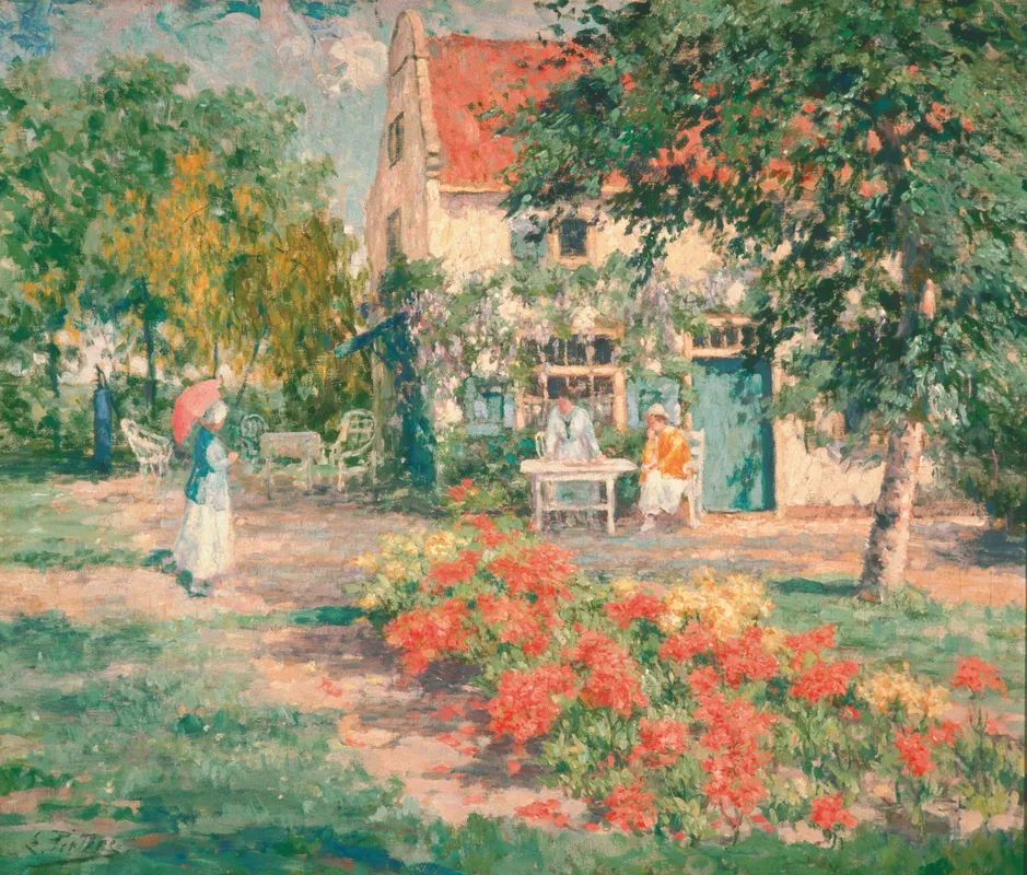 Op deze zonnige voorstelling figureren Anna Singer en Marie Pieters aan de tafel. Het huis van de kunstenaar wordt omringd door voorjaarsbloeiers: een Gouden Regen staat links van het witte huis, een Blauwe Regen groeit tegen de gevel op en op de voorgrond is een perk met bloeiende azalea’s te zien. Pieters behoort tot de vriendenkring van Anna en William Singer. Het echtpaar verwerft meerdere schilderijen van hem voor hun eigen collectie, waaronder dit doek. Naast zijn eigen tuin verbeeldt hij ook meerdere keren de tuin van de Singers.