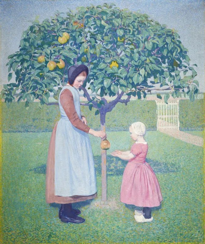 Hart Nibbrig schildert graag buiten en in de directe omgeving van zijn huis, ook zijn tuin met boomgaard en moestuin kiest hij vaak als onderwerp. Hij experimenteert met verschillende stijlen. In dit schilderij combineert de kunstenaar gemengde technieken. Zo is het gras en de lucht met korte strepen en stippen geschilderd, maar zijn de twee figuren en de appelboom meer realistisch met lijnen uitgewerkt. Uiteindelijk maakt Hart Nibbrig vooral naam als pointillist. Zijn zonnige landschappen, die bestaan uit gekleurde stippen en streepjes, worden een begrip.