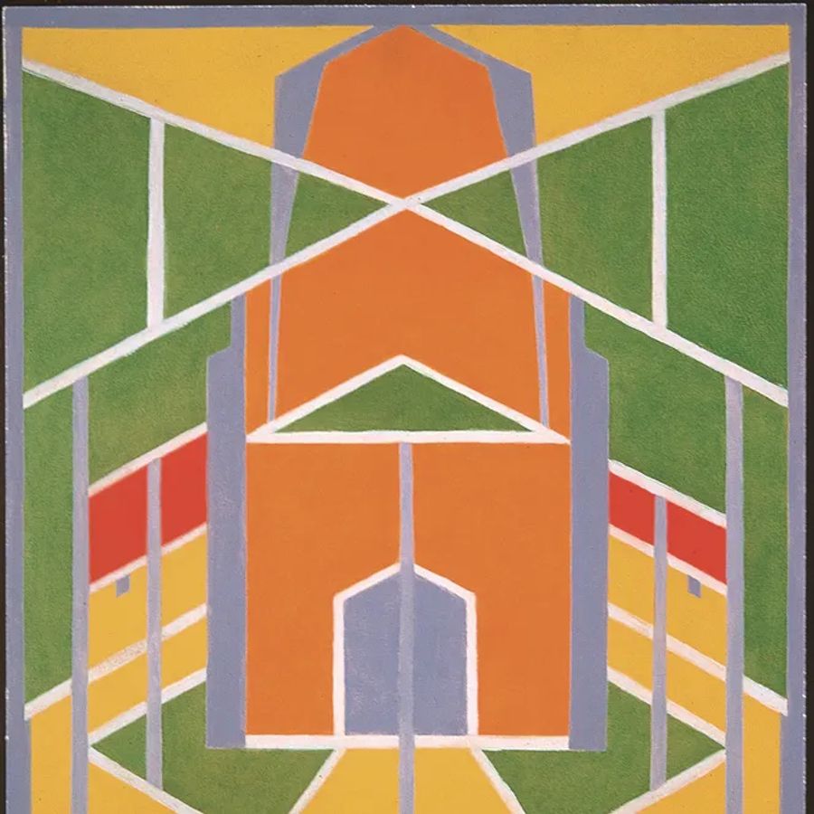 Lou Loeber is niet gelovig, maar socialiste in hart en nieren. Toch schildert ze net als veel andere kunstenaars in het Gooi het 15de-eeuwse Johanneskerkje. Ze heeft het kerkje met de ingang onder de klokkentoren sterk vereenvoudigd weergegeven in geometrische kleurvlakken. De vlakken onderscheidt ze van elkaar met verticale en diagonale lijnen die de statige compositie levendiger maakt. In eerste opslag lijkt de compositie symmetrisch, maar kijk eens goed, zijn de linker- en de rechterhelft echt aan elkaar gelijk?