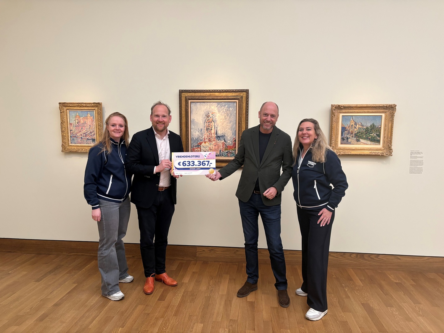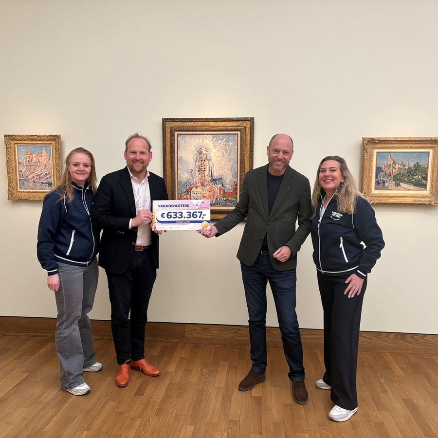 Laren, 16 maart 2026 | Wat een feestelijk moment! We voelen ons enorm blij én dankbaar. Vandaag namen museumdirecteur Doede Hardeman en algemeen directeur Evert van Os uit handen van Vera en Linda van de VriendenLoterij opnieuw een prachtige cheque in ontvangst. Dankzij alle deelnemers van de VriendenLoterij ontvangt Singer Laren dit jaar maar liefst €633.367!
